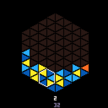 This entry is a demake of "bit Generations: Dialhex", which was released for the Gameboy Advance in 2006. You play in a hexagonal grid made up of triangles and the goal of the game is to keep the grid clear by rotating triangles within your reticle, to form hexagons of the same colour.